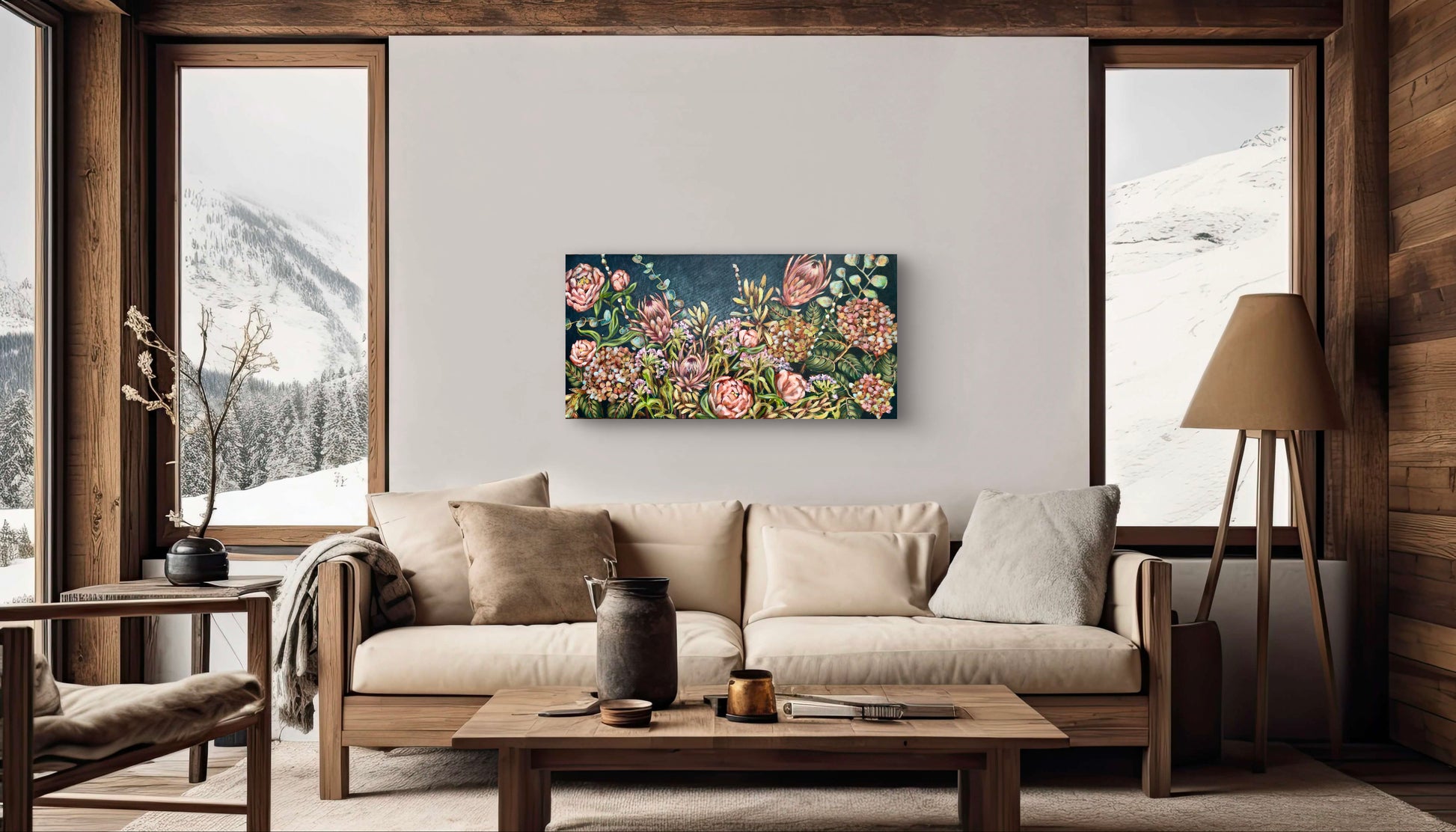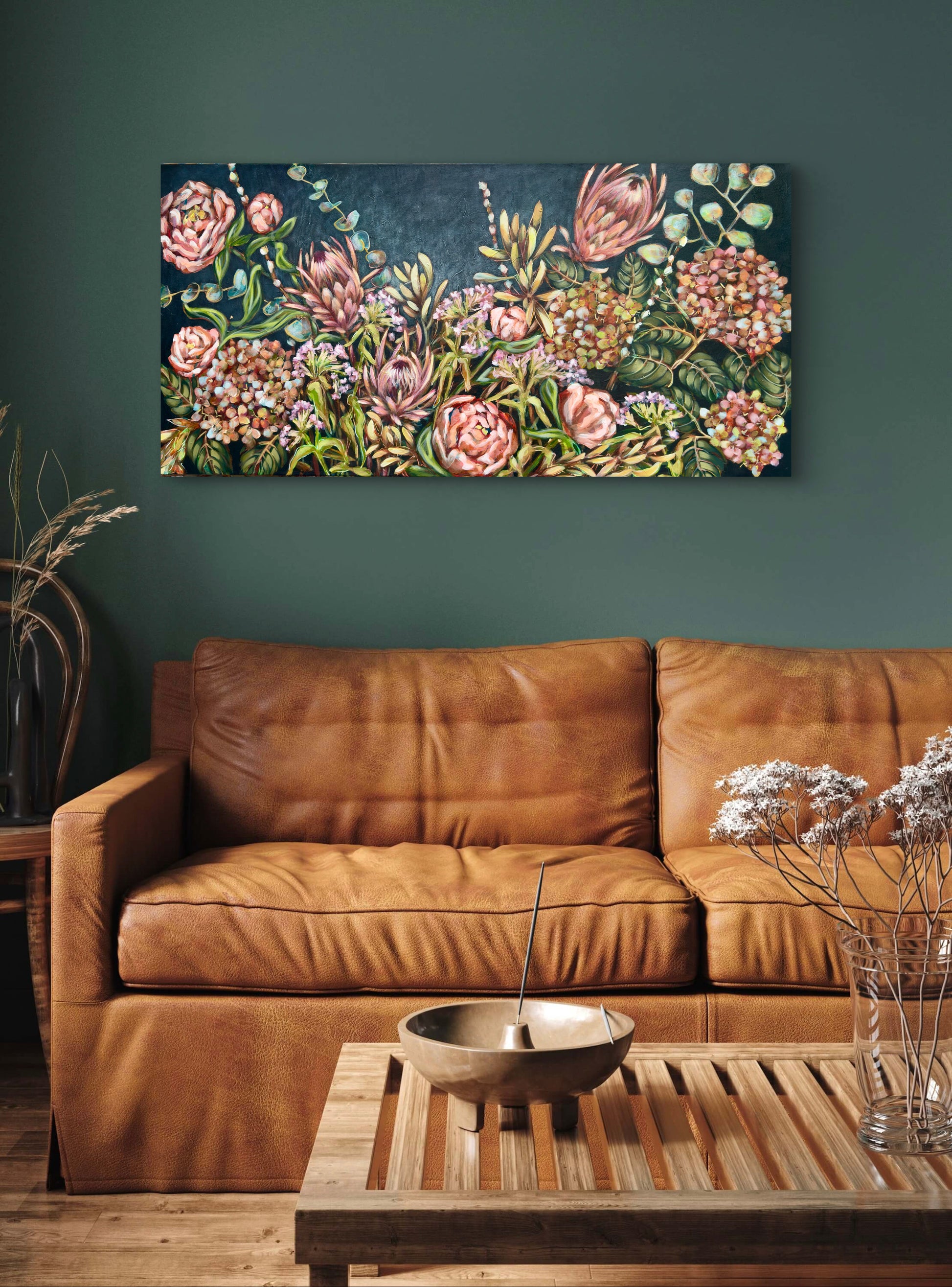 Bring the beauty of cut flowers into your home with this richly detailed, original acrylic painting. Bursting with peonies, proteas, eucalyptus, and hydrangeas, this painting is a celebration of abundance, texture, and softness.