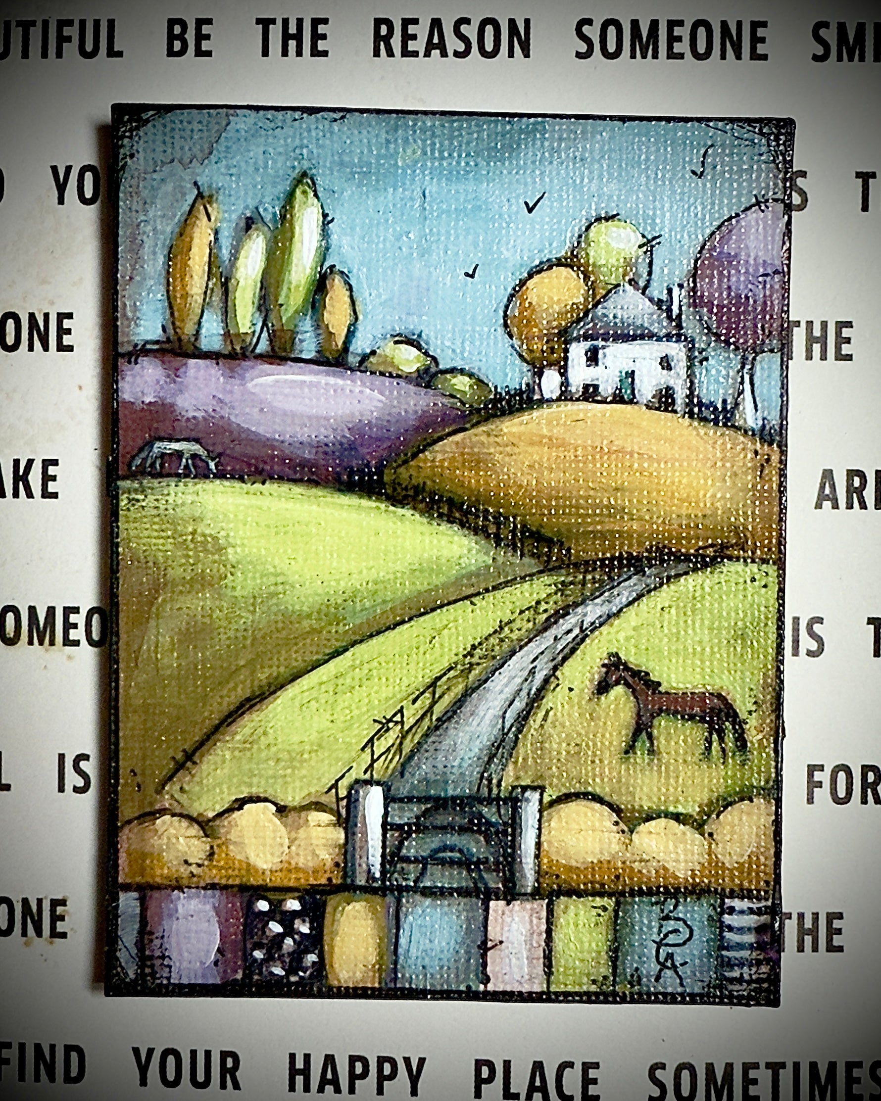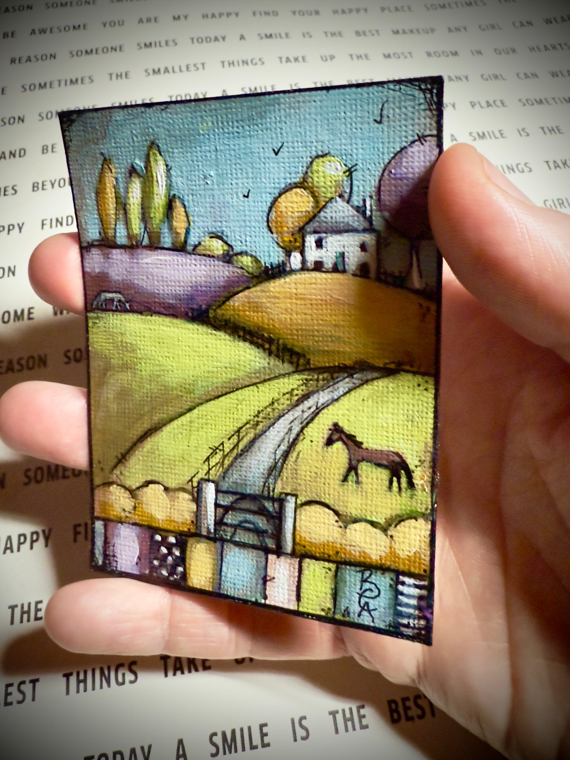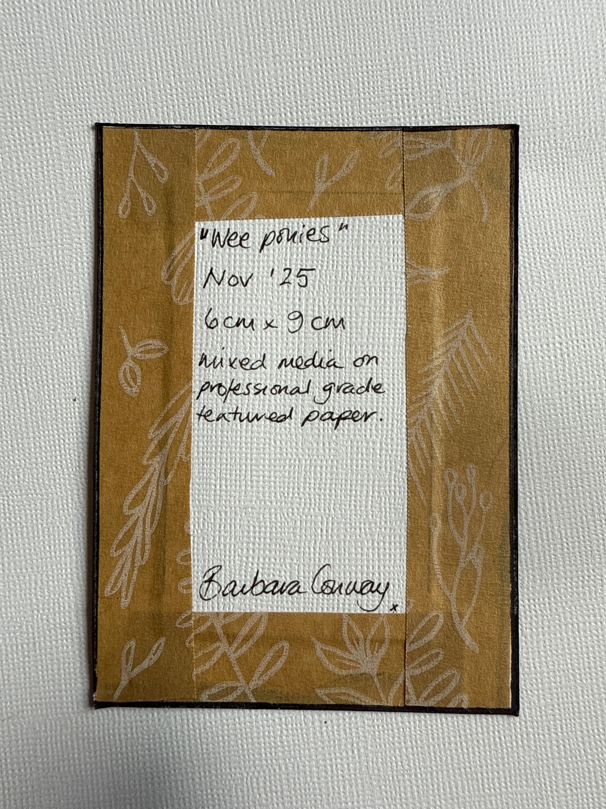 "Add some playful charm to your home with my "Wee Ponies" miniature painting. Measuring 2.5in x 3.5in, this original ACEO artwork is created with mixed media on professional grade paper. Its whimsical, folk art style is not only affordable but can easily be posted to your letterbox for a delightful surprise."